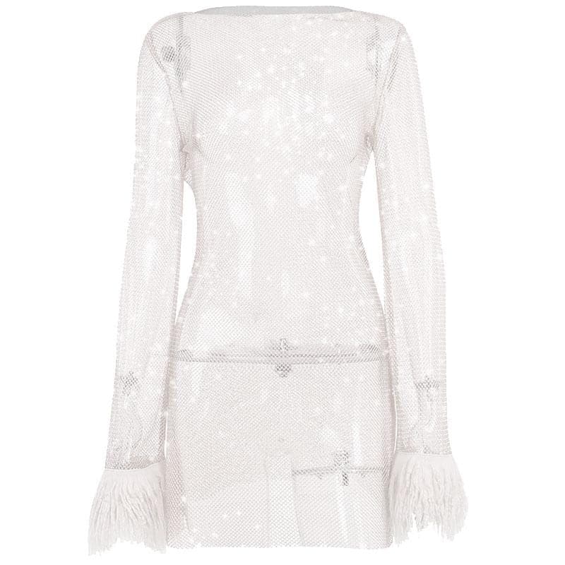 Long sleeve solid see through sheer mesh fluffy round neck mini dress